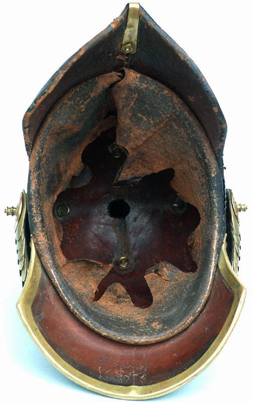 1867式尖顶盔的内衬没有变化,取消了黄铜帽脊,所以后帽檐内部看不到了黄铜帽脊延伸。