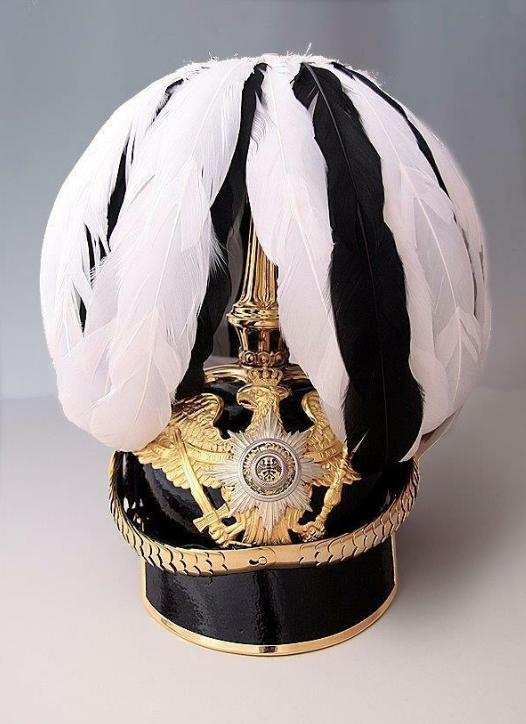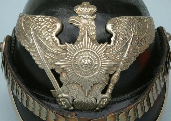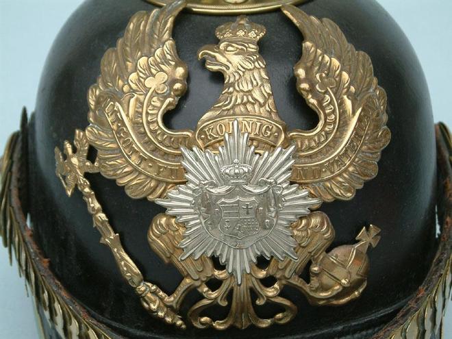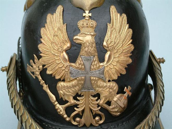 普鲁士近卫部队的鹰徽,中间是近卫之星。事实证明,1867式鹰徽的固定方式存在很大的缺陷,所以尖顶盔再次利用带螺纹螺栓和螺母进行加固。