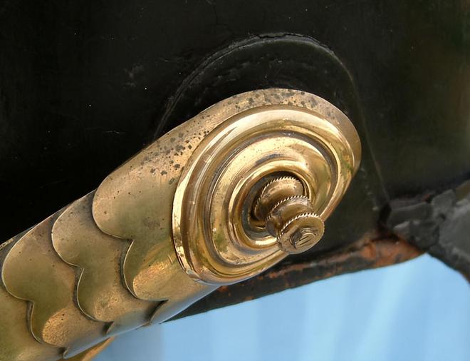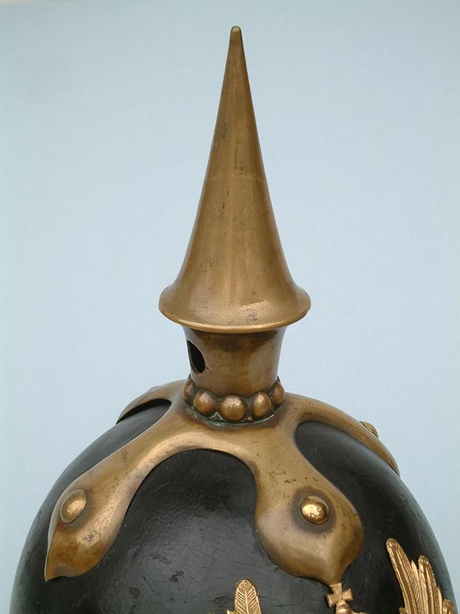 在尖顶盔背面,黄铜帽脊从尖顶底座一直延伸到后帽檐底部,并用两颗黄铜螺栓进行固定,以此增加尖顶盔强度和硬度。