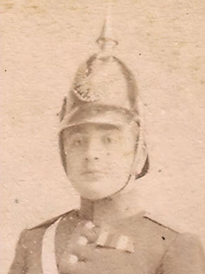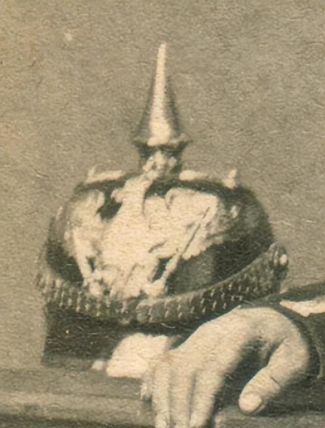 图中为一名近卫团的1860式尖顶帽,清楚了显示了尖顶帽的高度和鹰徽上的丝带,同时注意上面的近卫款式的鹰徽。