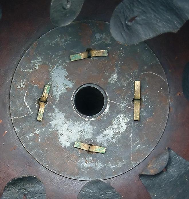 尖顶盔后部有一条从尖顶底座一直延伸到后帽檐的黄铜帽脊,帽脊用两颗螺栓固定,增加强度和硬度。从上一张内衬图中可以看到黄铜帽脊一直延伸到了后帽檐的内部,并用一颗螺栓固定住。黄铜帽脊还有一个作用就是遮盖了尖顶盔后部拼合的接缝处。