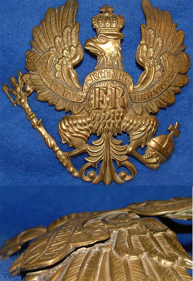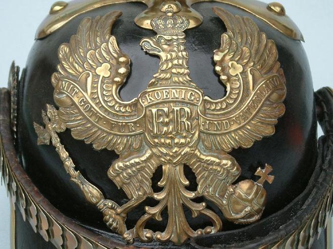 尖顶盔正面有尺寸为125毫米的金属鹰徽,大多数部队的鹰徽胸口为“FR”字样,掷弹兵的鹰徽胸口为“FWR”字样,为腓特烈·威廉君主(Friedrich Wilhelm Rex,Rex是古罗马君主称号)的缩写。