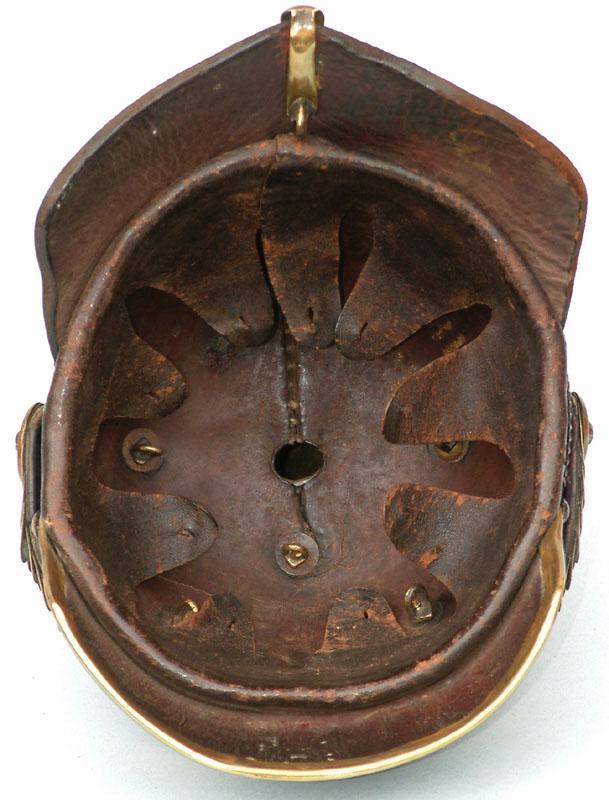 1842式尖顶盔的内衬由九片舌状皮革组成,皮革末端可以连接绳子进行内衬大小的调整。图中的尖顶盔后帽檐因为时间的原因弯曲变形,和前帽檐有黄铜镶边所不同,后帽檐通常会使用皮革镶边。为了更好固定尖顶盔,所有使用的黄铜螺栓内部均为半球形头。