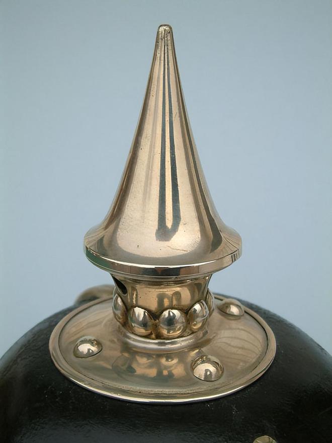 尖顶盔从底部开始计算整体高度可以达到38厘米。在尖顶盔右侧,固定下巴带的位置上有一个皮革制帽徽,帽徽直径75毫米,颜色为象征普鲁士的黑白黑。1857年开始大量推出了金属制的普鲁士帽徽,同时使用在后备和预备役尖顶盔上。