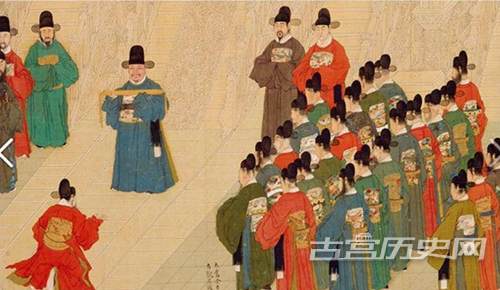 唐代官吏的礼帽,种类繁多。文武官吏都戴进贤冠。三品以上三梁,五品以上两梁,九品以上即国官一梁。杜甫的《丹青引》中写道“良将头上进贤冠,猛将腰间大羽箭”,指的就是唐代文武官员的服饰。